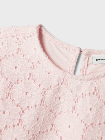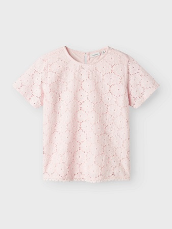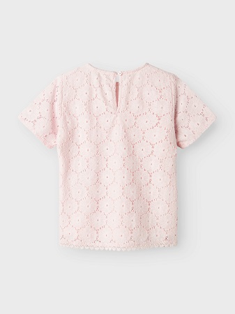 Den sötaste spetstoppen från Name It är det perfekta tillskottet till ditt barns vår- och sommargarderob. Med sin ljusa och luftiga design ger den både stil och rörelsefrihet för lek och äventyr. Den eleganta broderie anglaise-detaljeringen skapar en tidlös och söt look med sina vackra runda och ovala utskärningar. Toppen har en klassisk rund hals, korta ärmar och en praktisk knapp med ögla i nacken för enkel påklädning.