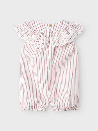 Den sötaste lilla rompern från Name It är en perfekt kombination av stil och komfort för de allra minsta. Med ett heltäckande randigt tryck skapas en lekfull och charmig design. Rompern är tillverkad i ett mjukt, vävt material och har vackra volang och spetsdetaljer som ger en extra söt touch. Elastiska fållar säkerställer en bekväm passform. Praktiska knappar och en ögla gör det enkelt att klä på och av.