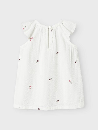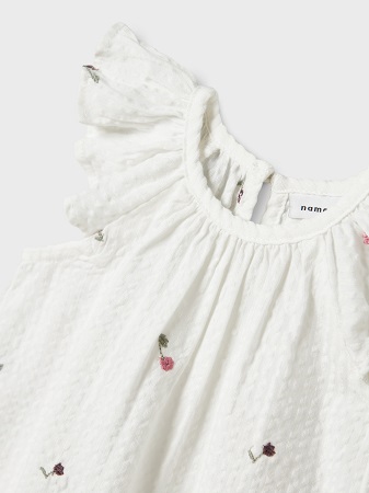 Supersöt sommarklänning från Name It, perfekt för varma dagar! Klänningen är prydd med små, broderade blommor i fina färger och har vackra volanger på både ärmar och runt halsringningen, vilket ger den en lekfull och feminin känsla. Den knäpps enkelt med en knapp i nacken och har en utställd kjol som ger en fin och luftig passform. Tyget är krinklat, vilket ger klänningen en fin textur och extra charm.