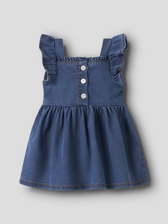 Supersöt klänning i mjuk denim från Name It, perfekt för både vardag och festliga tillfällen. Klänningen är tillverkad i ett behagligt och mjukt material som känns skönt mot barnets hud och ger en bekväm passform hela dagen.Designen har smala axelband med fina volangdetaljer som ger en lekfull och söt touch, tillsammans med en fyrkantig halsringning som ger klänningen en modern och stilren look.