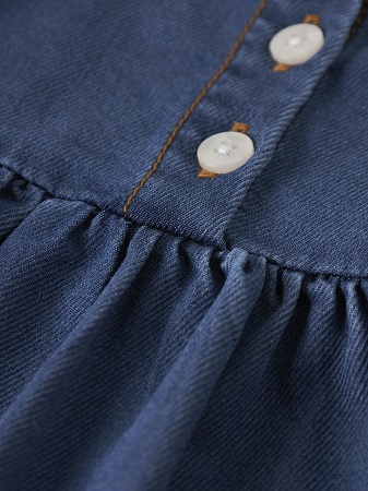 På baksidan finns tre dekorativa knappar som inte bara är en praktisk uppknäppningsdetalj utan också en fin designaccent. Den utställda kjolen ger rörelsefrihet och en härlig siluett som barn älskar att snurra i. Den mjuka kvaliteten gör klänningen enkel att bära hela dagen, oavsett om det är lek, utflykt eller kalas.
