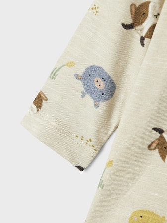 Supersöt body från Name It i ett mjukt och behagligt material som är skonsamt mot barnets hud. Bodyn har rund halsringning och långa ärmar, samt praktiska tryckknappar vid axeln och i grenen som gör av- och påklädning enkel och smidig. Den kommer i en fin beige färg och är dekorerad med små djur i lekfulla färger – en charmig detalj som gör bodyn både söt och rolig att bära.