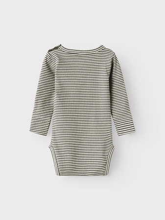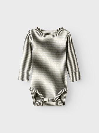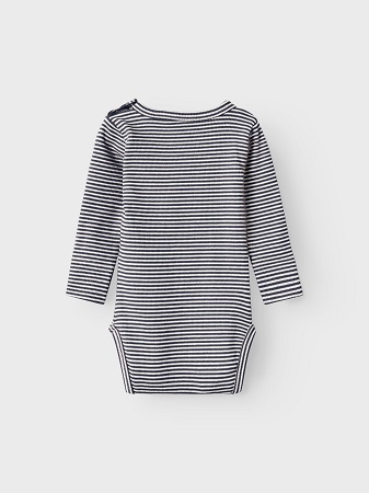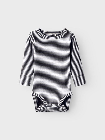 Söt randig body från Name It. Bodyn har rund halsringning, lång ärm och stängs med tryckknappar i gren och uppe vid axel. Bodyn finns i tre olika färger orange, grön och Marin. Till bodyn finns även matchande leggings, art.nr: 311260.