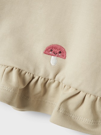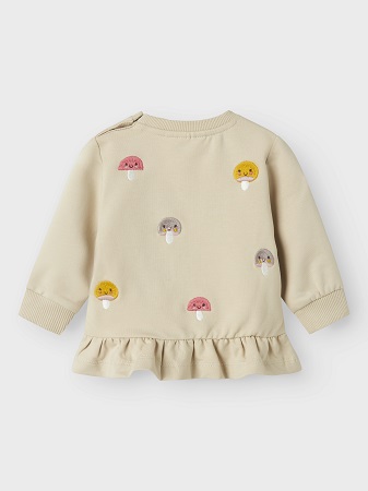 Den finaste sweatshirten från Name It en mjuk och bekväm tröja med charmiga detaljer. Tröjan har rund halsringning, långa ärmar och ribbade muddar som ger en skön passform. En söt peplumdetalj nedtill ger ett lekfullt uttryck, och en liten knapp vid halsringningen gör den enkel att ta av och på. Den beige färgen kombineras med små broderade svampar i glada färger som ger ett fint och unikt utseende.
