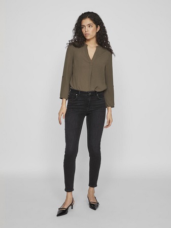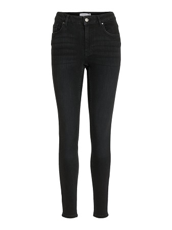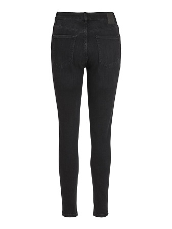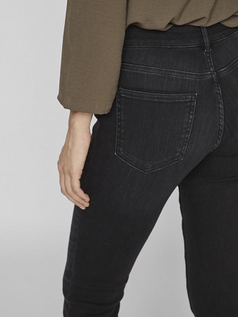Jeans från Vila. Jeansen har en normalhög midja och är i en tajt modell som sitter nära kroppen och ger en definierad silhuett. Jeansen är en femficks-modell, stängs med knapp och dragkedja och har en snygg mörk tvätt.
