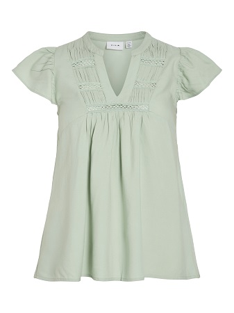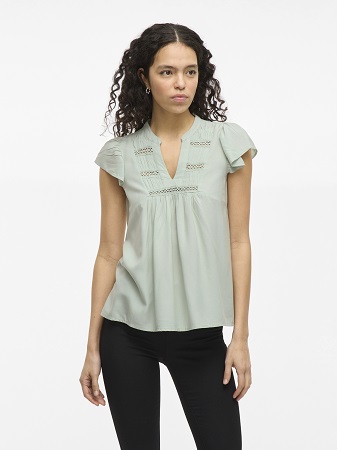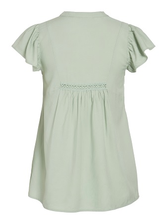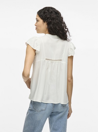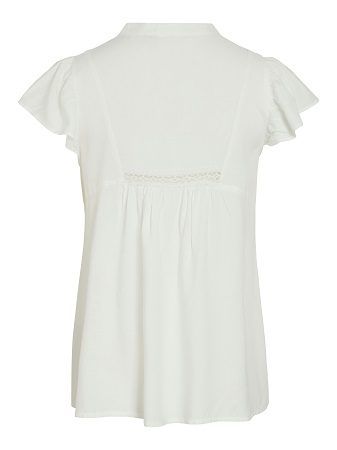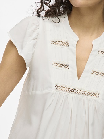 Elegant blus från Vila. Blusen har en smickrande V-ringning, feminina ärmar med volangdetalj och vackra spetsdetaljer som ger ett stilrent och sofistikerat intryck. Tillverkad i mjuk viskos, ett lätt material med fint fall och silkeslen känsla, erbjuder blusen både komfort och elegans. Den normala passformen gör den lätt att matcha med både jeans, kjol eller kostymbyxor för en komplett look.