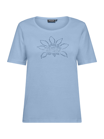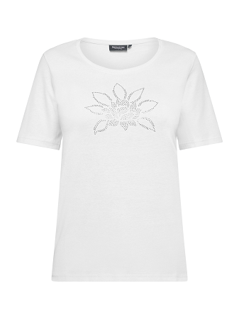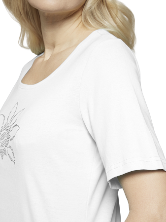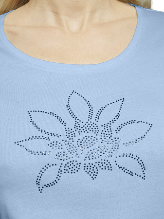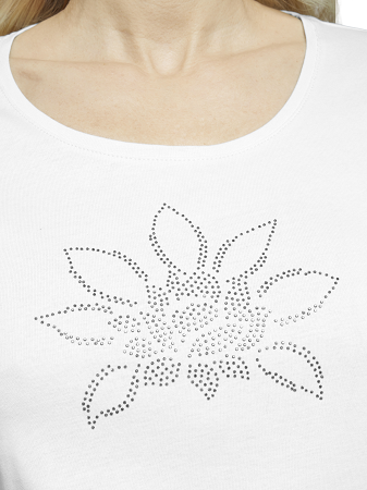 Vacker topp från Signature en stilren och bekväm damtopp i mjuk bomull som passar perfekt till både vardag och fest. Toppen har korta ärmar, rund halsringning och en normal passform som ger en smickrande silhuett. Framtill pryds den av en elegant detalj med glittrande strasstenar i ett blomliknande mönster en feminin touch som lyfter hela outfiten.