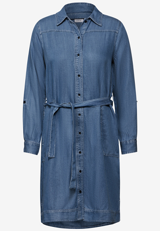 Stilfull jeansklänning med krage från Cecil, är det perfekta valet för en elegant och bekväm look. Klänningen har en klassisk denim-look men är tillverkad i tunn och mjuk Lyocell, vilket ger ett fint och följsamt fall. Med sin genomgående knäppning framtill kan den enkelt bäras både som en klänning eller helt öppen som en lång kappa. De långa ärmarna med manschett och turn-up-funktion gör klänningen mångsidig och lätt att anpassa efter stil och väder. Den midilånga designen, med slitsar på båda sidor, ger ett modernt och luftigt intryck.