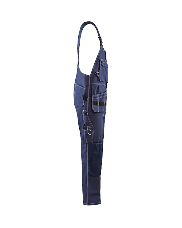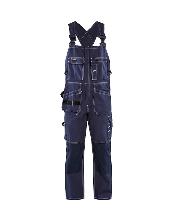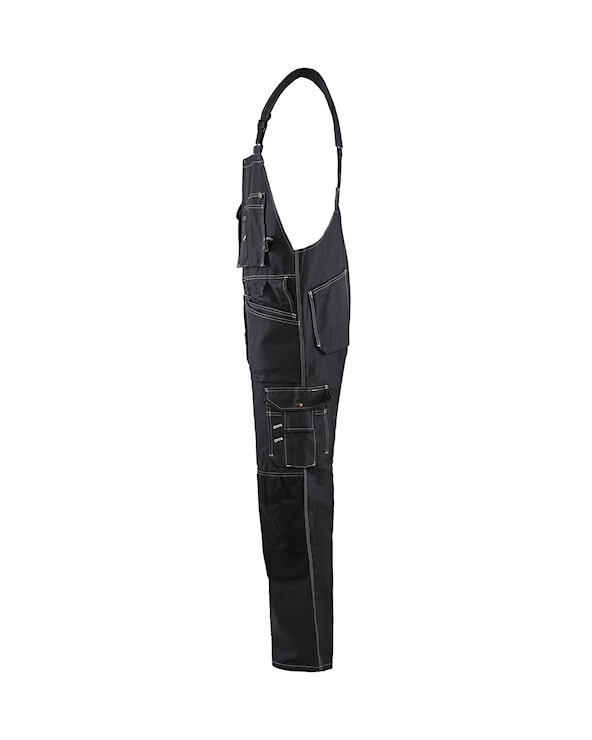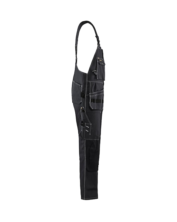 Hängselbyxa med två löst hängande bröstfickor med tryckknappar och säkerhetsband. Byxan har CORDURA-förstärkta knän och bakfickor.